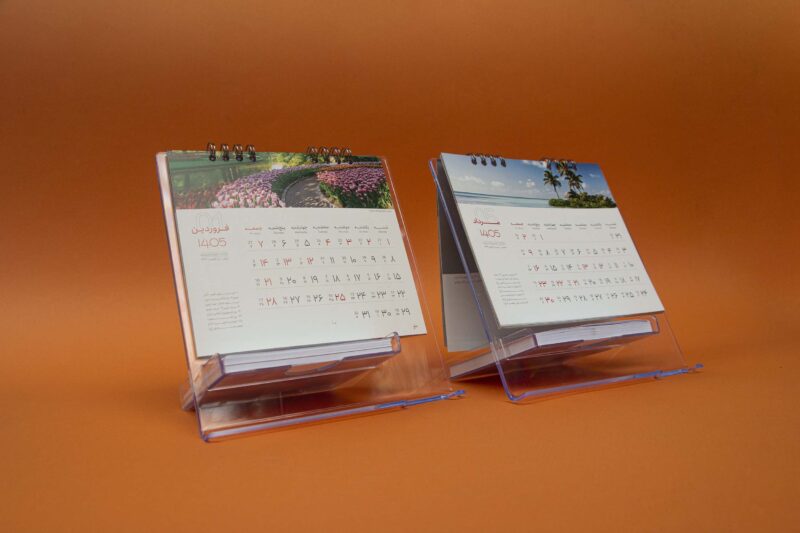پایه تقویم از پلکسی شفاف ساخته شده و ظاهر مدرن و مرتبی به میز کار یا محیط اداری میبخشد. صحافی فنری نیز باعث میشود ورقزدن صفحات بهراحتی و بدون آسیب به تقویم انجام شود.