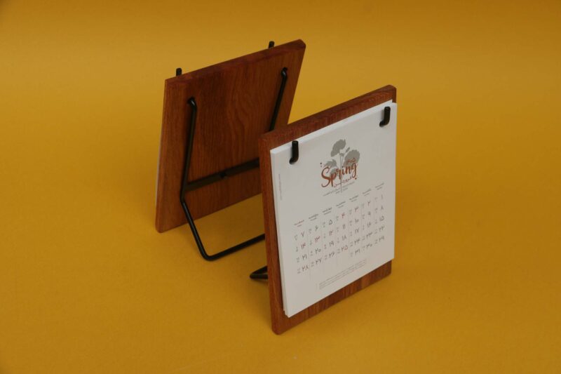 بدنه تقویم از چوب راش طبیعی ساخته شده که حس گرما و اصالت را به محیط منتقل میکند و در کنار آن، پایه فلزی استحکام و ثبات لازم را برای استفاده روزمره فراهم میسازد.