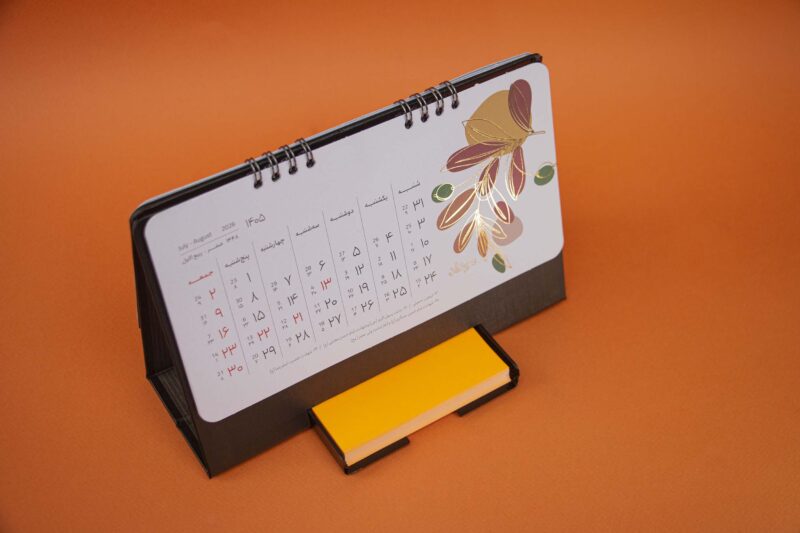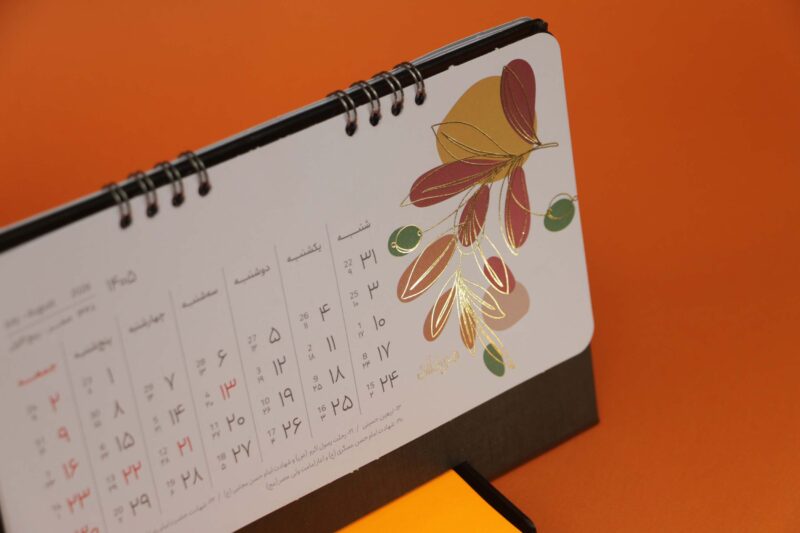 پایه تقویم از گالینگور مشکی ساخته شده که علاوه بر استحکام، جلوهای رسمی و مرتب به میز کار میدهد. صحافی فنری نیز باعث ورقزدن آسان و استفاده راحت در طول سال میشود.
